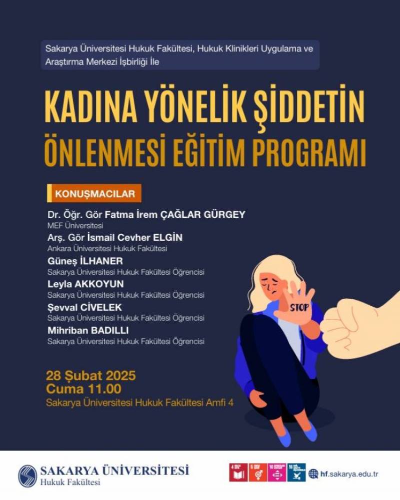 Sakarya Üniversitesi Hukuk Fakültesi ve Hukuk Klinikleri Uygulama ve Araştırma Merkezi iş birliğiyle 28 Şubat 2025 tarihinde "Kadına Yönelik Şiddetin Önlenmesi Eğitim Programı" düzenlendi.